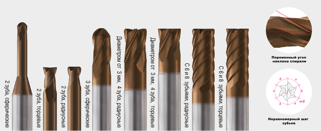 Для этого используются две ключевые технологии: • Неравномерный шаг зубьев: Расстояние между режущими кромка ми у 4-, 6- и 8-зубых фрез специально сделано разным. Каждый зуб вступает в работу через свой, уникальный промежуток времени. Это создает неритмичные силовые импульсы. У системы просто нет единой частоты, чтобы войти в резонанс. • Переменный угол наклона спирали: В 4-зубых фрезах эта техно логия дополнительно улучшает процесс. Разный угол наклона канавок постоянно меняет направление сил резания, что эффективно гасит любые возникающие колебания и обеспечивает исключительную плавность обработки.