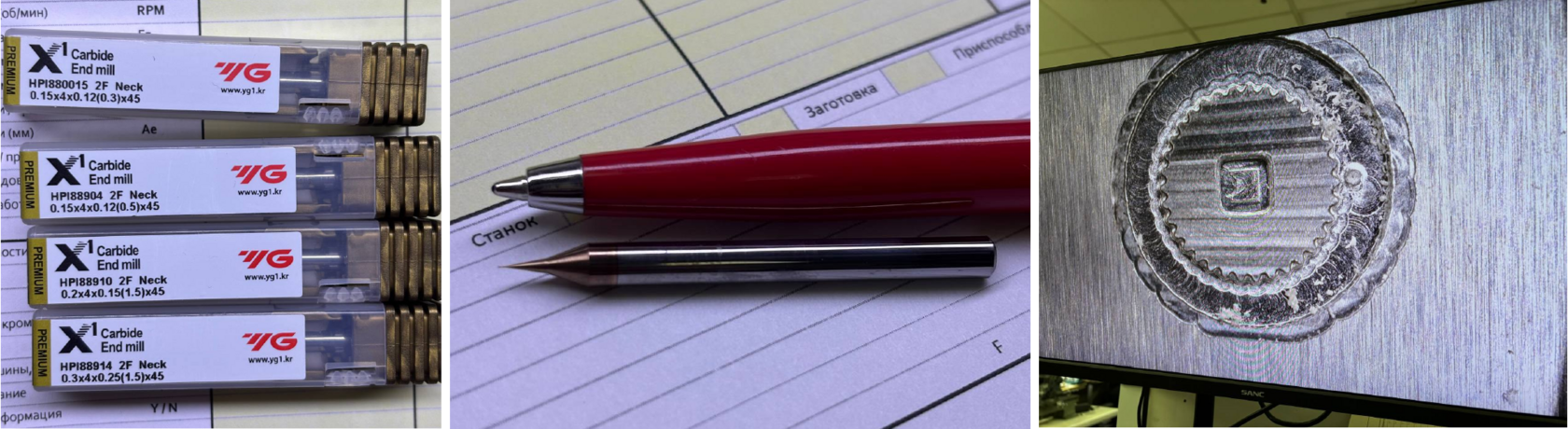 Задача испытания - обработать кобальтовый сплав Stellite 20 твердостью 65 HRC. Stellite — один из самых сложных материалов. Он создан, чтобы сопротивляться износу, и его структура работает как наждак, моментально стирая режущую кромку. Вдобавок он склонен "закаляться" прямо под фрезой, становясь еще тверже. Сложность добавлял и размер: диаметр фрезы — всего 0.3 мм. При таком размере даже крошечное биение в несколько микрон сразу ломает фрезу.